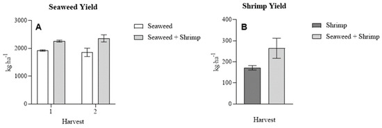 Yields (kg·ha−1) of (A) seaweed and (B) shrimp per harvest and per treatment.