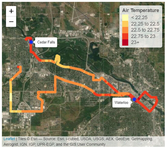 A thorough explanation regarding how the temperature measurements were actively collected can be found in Coproski et al. [6]. To summarize, a minimum of 3623 (WCF) and a maximum of 29,817 (Des Moines) temperature measurements were recorded during three separate time periods (afternoon, evening, and nighttime) for as many as nine Iowa urban areas (Waterloo–Cedar Falls are bordering, sister cities). Figure 5 shows the Iowa urban areas where air temperature data were collected. Exceptions to the 3× time collection (afternoon, evening and nighttime) are attributed to equipment issues or inclement weather (thunderstorm) that caused nighttime measurements to be missed in Waverly and Fort Dodge and evening measurements being skipped in Marshalltown.