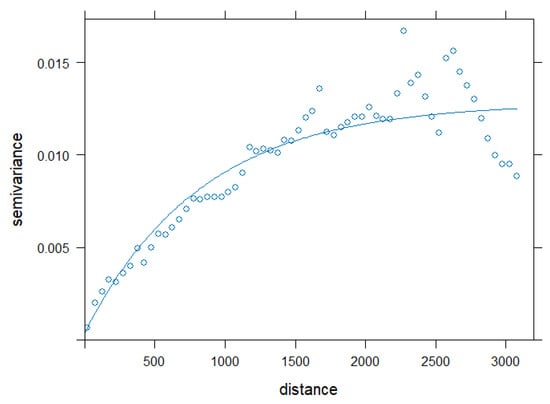 A geostatistical model [28,29] provides a different way, compared to a trend surface model, to incorporate the X-Y locations into a spatial model. Geostatistical models explain any spatial correlation present in the region. Spatial correlation means that two air temperatures observed closer in geographic space are much more similar (after adjusting for model covariates) than a pair of air temperatures observed farther apart. An empirical variogram, seen in Figure 2, constructed from the OLS regression residuals, provides evidence of spatial correlation [30]. Note that an exponential theoretical variogram was fitted to the empirical variogram in Figure 2 for illustrative purposes only. A geostatistical spatial linear model fits the exponential correlation structure, simultaneous with the landscape variables. Figure 2 is a diagnostic tool that illustrates the need to model spatial correlation using a geostatistical model. Therefore, an exponential correlation function was fitted, simultaneously with the twenty landscape variables in a geostatistical model, to the nighttime WCF air temperature data [31], resulting in a spatial correlation of 3452.7 m, or a little over two miles.