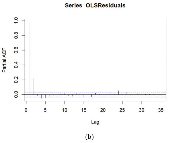 (a). Autocorrelation Function Plot for the residuals from the OLS Multiple Regression. Note that X = Lag is measured in time and the dashed horizontal lines represent confidence intervals. All lags in the ACF plot are statistically significantly different from zero. (b). Partial Autocorrelation Function Plot for the residuals from the OLS Multiple Regression. Note that X = Lag is measured in time and the dashed horizontal lines represent confidence intervals. The first two lags in the PACF plot are statistically significantly different from zero.