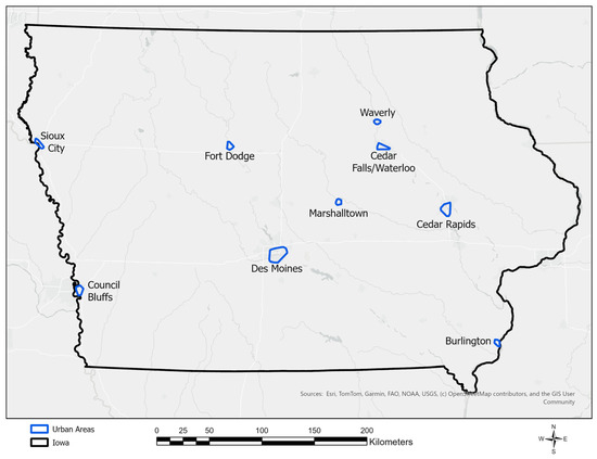 - Iowa Demographics Iowa Cities by Population. 2025. Available online: https://www.iowa-demographics.com/cities_by_population (accessed on 26 February 2025).