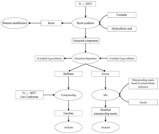 Table 15 shows that obtaining gasoline at 126.84 wt.% is possible by raw materials, of which 44.39 wt.% by raw materials are components of the initial fr. ≤ 200 °C. It is also possible to obtain related products: resin—8.59 wt.% on raw materials, which can be used as an adhesive additive to bitumens [7,13], and extract 48.33 wt.% on raw materials, the application of which is discussed below.