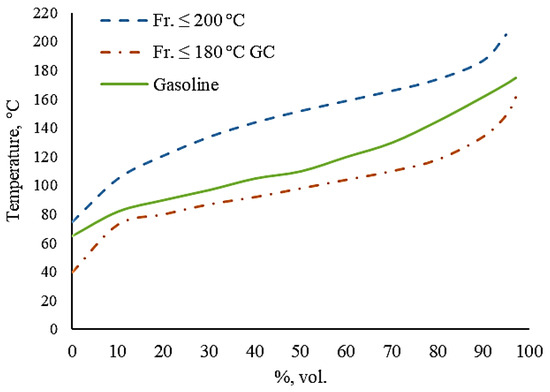 Table 1 and Table 2 show that the fr. ≤ 200 °C does not meet the requirements for gasoline regarding specific indicators, primarily density. A high bromine number also characterizes it. These data are confirmed by the results of chromatographic analysis, which indicate a high content of aromatic compounds (including benzene, the content of which is 2.96 wt.%) and unsaturated compounds, the presence of which is undesirable in commercial gasoline.