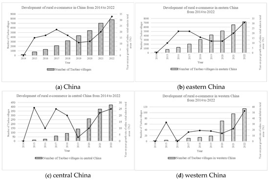 As information technology penetrates rural areas, the EC is emerging as a new catalyst for sustainable development in rural areas [4]. EC is a typical approach to transform the traditional real economy by digital technology and form an integrated rural industry support system by combining Internet resources with traditional rural elements. Figure 1 shows the overall growth trend of Taobao villages and sales. EC reduces disparities in information, enables low-income populations to connect to enormous markets, introduces employment and business opportunities, and boosts income [5].