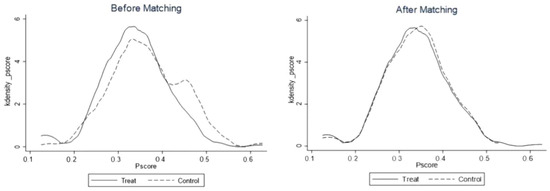 Table 8 shows the results of a balancing test to determine if the matching estimation results of the preceding propensity score balanced the data. This paper shows K-nearest neighbor matching. The results show that after matching, the control variable standardized deviation rates drop below 10%. The control variables’ t-test findings do not disprove the null hypothesis, balancing their covariate distributions. Thus, propensity score matching matches the balancing test findings.