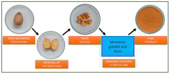 Before the catalytic tests, the studied catalyst was appropriately prepared. The avocados were purchased in Polish supermarkets. First, the flesh of the avocado fruit was separated from the seed. The seeds were stripped of their husk and ground in a laboratory grinder to obtain smaller particles. The material was then placed in a laboratory dryer at 50 °C for 20 h. After the drying process, the material was ground again to achieve a powder-like consistency and subsequently dried the second time under the same conditions to remove any remaining water content (Figure 1).