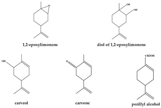 Mass balances were prepared for all post-reaction mixtures obtained in the studies on the effect of temperature, the amount of the catalyst, and the reaction time. Based on the obtained mass balances, the main functions describing the process of oxidation were calculated. These functions included the conversion of limonene and the selectivities of the appropriate products, such as 1,2-epoxylimonene, 1,2-epoxylimonene diol, carveol, carvone, and perillyl alcohol. Figure 2 shows the main products of limonene oxidation, which were detected in the post-reaction mixtures.
