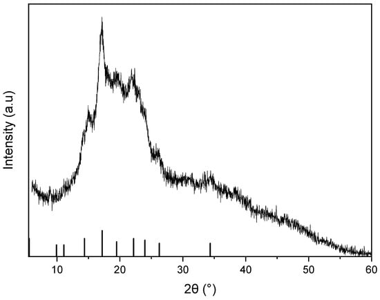 Figure 4 presents the XRD spectrum of the powder obtained from the dried avocado seeds. The XRD pattern presented in Figure 4 exhibits a broad peak centered at the 2θ angle of 20–25°, which suggests the presence of an amorphous phase or poorly crystalline material. The in-depth analysis using the X’Pert HighScore software ver. 1.0 indicated the presence of starch in the sample (JCPDS No. 39-1912). The starch’s reference peaks are marked on the figure as vertical bars.