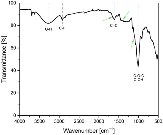 Figure 5 shows the FT-IR spectrum of the powder obtained from the dried avocado seeds. The Fourier Transform Infrared spectroscopy method was utilized to analyze and identify the functional groups that existed in the tested material. Dried and ground avocado seeds (in the form of powder) were tested in the wavelength range of 4000 to 500 cm−1. In the obtained spectrum, the broad band between 3590 and 2990 cm−1 is visible, corresponding to the presence of hydroxyl groups intermolecularly connected by hydrogen bonds [19]. The narrow, low-intensity band at 2922 cm−1 corresponds to the presence of the C-H bond. Another narrow, low-intensity peak, which appeared near 1614 cm−1, is considered to be associated with an aromatic ring (C=C) [20]. The peak with the highest intensity appeared at 1007 cm−1, indicating the presence of C-OH or C-O-C groups [21]. The narrow, intense band at 537 cm−1 is identified as basic vibrational movements related to the structure of the pyranose ring found in starch [22]. In the work of J.Br. Tarigan et al. [23], which presents the application of the waste passion fruit peel as the heterogeneous catalyst for biodiesel production, the characteristic stretching and bending vibration of C−O groups from potassium carbonate in the FT-IR spectrum of this material were described at peaks of 1654, 1386, and 1110 cm−1. These bands are also present in the FT-IR spectrum of dried avocado seeds powder studied in this work (these are low-intensity bands which are marked with green arrows), which confirms the composition results obtained by the EDX method for this material that showed the presence of potassium in the dried avocado seeds powder sample [23].