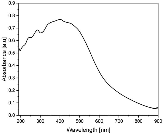 The UV-VIS studies were conducted in the range of 190 to 900 nm. Avocado seed powder showed strong absorbance from 190 to 600 nm. The ultraviolet range shows several narrow band peaks reaching a maximum at wavelengths of approximately 190 nm, 247 nm, 290 nm and 340 nm. This may indicate the content of flavonoids and their derivatives [25]. In the visible light region, there is a noticeable broad band from 400 to 500 nm with high intensity with an absorption maximum (0.769) at 403 nm. The significant absorption of wavelengths in the range of 400–500 nm (corresponding to blue and green light) is a characteristic feature of red-orange objects, as these wavelengths correspond to their complementary colors. Absorbance decreased significantly above 580 nm, consistent with the obtained reddish-orange color of our catalyst powder.