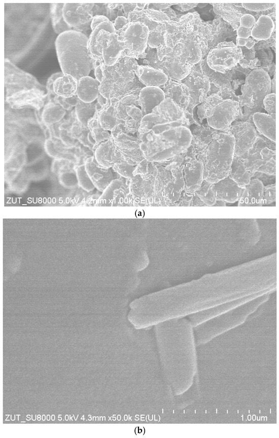 The SEM images of dried avocado seeds powder. Magnification 1000× (a) and 50,000× (b).