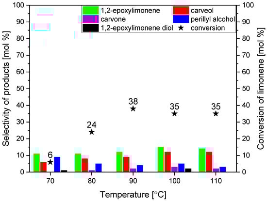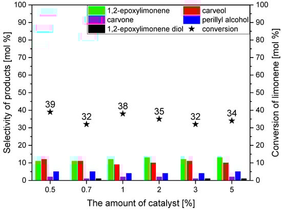 Figure 8 shows that the conversion of limonene increases from 6 to 38 mol% in the temperature range of 70 to 90 °C, and later, despite the temperature increase, it does not undergo any significant changes. The conversion of limonene is one of the main functions of the process, based on which the most favorable values of the tested process parameters will be selected. The second is the selectivity of the transformation to 1,2-epoxylimonene—the main product of the studied process. At the same time, it can be said that the highest selectivities of most of the obtained products are obtained at the temperature of 100 °C (except for perillyl alcohol, which is formed with the highest selectivity at the lowest tested temperature, i.e., at 70 °C). It should be noted that the differences in the selectivity values of individual compounds above 80 °C compared to the values obtained at 80 °C, visible in Figure 8, are insignificant and amount to about 2–3% mol, which means that they are within the error limits of the GC method. It can, therefore, be assumed that there are no significant changes in the selectivity of the transformation to the main products above 80 °C. However, considering that the next two stages of the study will examine the effect of the amount of catalyst and the reaction time, it was decided to adopt a temperature higher than 80 °C, i.e., 90 °C, as the most advantageous. Perhaps by selecting these two remaining parameters, it will be possible to increase the conversion of limonene and the selectivity of the transformation to the main products.