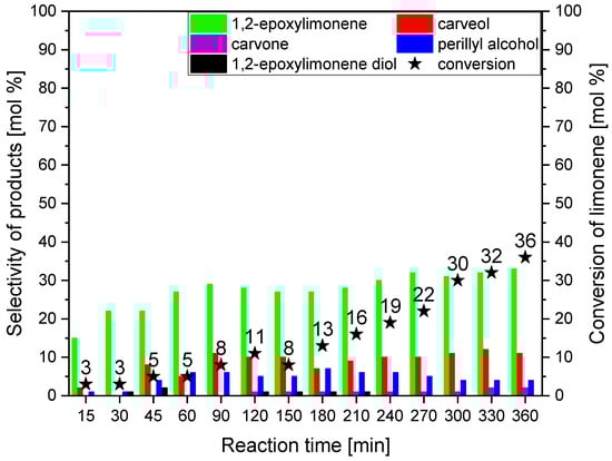 Analysis of Figure 10 shows that with the extension of the reaction time, there is a significant increase in the selectivity of the transformation to 1,2-epoxylimonene from 15 to 33 mol%. At the same time, the selectivities of the transformation to carveol are not high (changes from 1 to 11 mol% are only observed), and the dominant product is still 1,2-epoxylimonene. The epoxy compound is stable under the reaction conditions, and no hydration of the epoxy ring and transformation of 1,2-epoxylimonene to 1,2-epoxylimonene diol is observed here. Carvone is not formed at all for reaction times from 15 min to 90 min, and for longer reaction times, its selectivities are low and amount below 2 mol%.