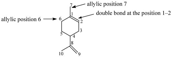 Selectivity of the appropriate product = (number of moles of the appropriate product/number of moles of reacted limonene) × 100 [mol%].