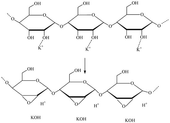 After analyzing the obtained results and presenting the above main directions of the limonene oxidation process, a question arises related to explaining the mechanism of formation of limonene oxygenated products on the avocado seed powder catalyst. First of all, the role of starch and potassium, present in the composition of the tested catalyst, seems to be very important in this mechanism. Starch has a lot of hydroxyl groups, but its chemical character is neutral. Protons in these hydroxyl groups do not exhibit acidic properties because there are no electron-withdrawing groups that could stabilize the O2− anions formed after the splitting of protons. However, if the catalyst containing starch also contains potassium in the form of, e.g., KOH or K2CO3 (based on the FT-IR spectrum presented earlier, we can state that our material contains K2CO3), then a change in the chemical character of—–OH groups in starch and activation of the catalyst surface may occur. Probably, as a result of the interaction of K+ ions with –OH groups of starch, acidic centers of the catalyst with easily cleaved (mobile) protons are formed. In order to verify these conclusions, we measured the total acidity of the catalyst in the form of powder from dried avocado seeds. We obtained the following result: 0.36286 mmol/g. The obtained value indicates the acidic nature of the catalyst we tested. Below, in Figure 12, we present a possible way of formation of acid centers in the starch structure in the presence of potassium ions.