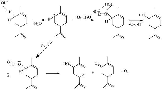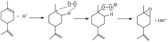Based on the earlier publication by A. Wróblewska [26], we would like to propose a probable mechanism for obtaining the main products of limonene oxidation (1,2-epoxylimonene, carveol and perillyl alcohol)—Figure 13 and Figure 14. However, this is only a preliminary proposal, which will require further research in the future and consideration of other routes of limonene oxidation.