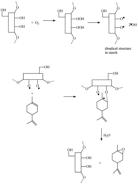The reaction of oxygen with hydroxyl groups present in the starch structure—in this way a diradical structure is formed, which reacts with the limonene molecule.