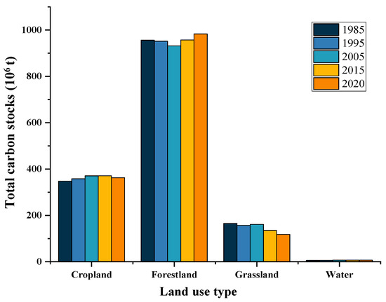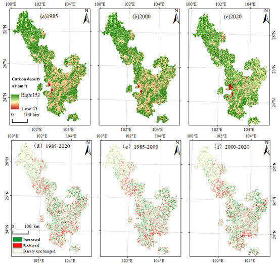 - From 1985 to 2020, carbon storage in the karst fault basin exhibited a fluctuating downward trend. This was primarily due to an increase in carbon storage in construction land and cultivated land and a decrease in carbon storage in grassland. The central part of the karst fault basin experienced significant carbon storage loss, while the carbon density in the marginal areas was relatively high.