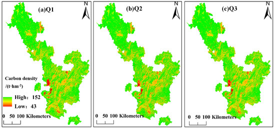 3.3. Spatial Changes of Carbon Density in Three Prediction Scenarios at the County Scale
