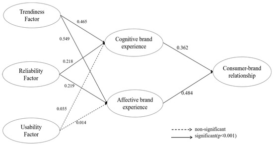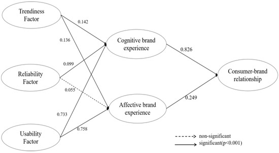 The structural equation modeling framework in this study utilized six latent constructs measured through psychometrically validated instruments. The exogenous variables comprised three omnichannel identity dimensions: (1) Trendiness Factor (measured through seven items assessing perceptual attributes: “emotional”, “young”, “refreshing”, “sophisticated”, “active”, “various”, and “lively”); (2) Reliability Factor (measured through six items, evaluating perceptions of “consistency”, “safety”, “accuracy”, “stability”, “professionalism”, and “honesty”); and (3) Usability Factor (measured through five items, assessing functional attributes of “convenience”, “ease”, “rationality”, “functionality”, and “usefulness”). The endogenous variables incorporated (4) Cognitive Brand Experience (operationalized through three items, measuring intellectual stimulation, curiosity arousal, and analytical engagement); (5) Affective Brand Experience (operationalized through three items, assessing emotional response, sensory engagement, and hedonic satisfaction); and (6) the Consumer–brand Relationship (measured through five items, evaluating psychological connection, identification, and relational attachment). All measurement items employed five-point Likert scales (1 = “strongly disagree” to 5 = “strongly agree”). The discriminant validity of these constructs was empirically verified through confirmatory factor analysis, with all constructs demonstrating composite reliability coefficients exceeding the conventional threshold of 0.7 (ranging from 0.838 to 0.882), and average variance extracted values approximating or exceeding 0.5 (ranging from 0.494 to 0.578), thus satisfying established psychometric criteria for structural equation modeling applications as prescribed by Mardia et al. [54].