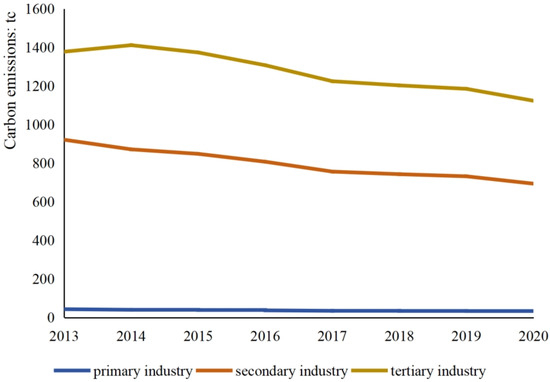 As shown in Figure 1, based on the data provided for Beijing’s energy-related carbon emissions from 2013 to 2020, energy-related carbon emissions were segmented by primary, secondary, and tertiary industries. Overall, a notable downward trend is observed across all three sectors—a strong indication that various policy measures, technological advancements, and structural economic shifts have collectively fostered reduced carbon intensity.