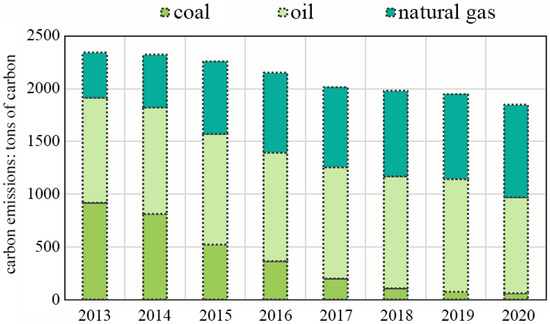 Figure 2 analyzes Beijing’s energy-related carbon emissions based on coal, oil, and natural gas consumption from 2013 to 2020, revealing distinct patterns tied to specific policy initiatives and market shifts.
