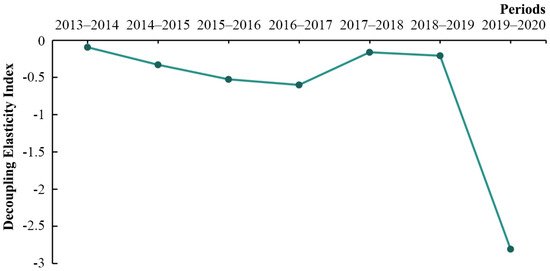 Changes in the energy-related carbon emission decoupling elasticity index in Beijing from 2013 to 2020.