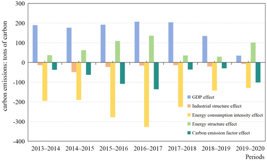 LMDI decomposition of carbon emissions from production and energy consumption in Beijing from 2013 to 2020.