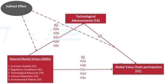 Several external market drivers (EMDs) have been identified as affecting a company’s ability to participate in GVCs. These include economic stability, technological resources, cultural adaptation, and environmental policies [14,15]. It has been shown that macroeconomic stability affects investment confidence, trade openness, and cross-border supply chain integration [12,16]. This means that economic conditions are very important for people who want to trade. Similarly, regulatory compliance has emerged as an essential factor as firms navigate complex legal frameworks, trade policies, and environmental standards in global markets [17,18]. The growing importance of sustainability in international trade has further transformed business requirements, with firms increasingly needing to adhere to environmental regulations to maintain competitive positions [19,20].
