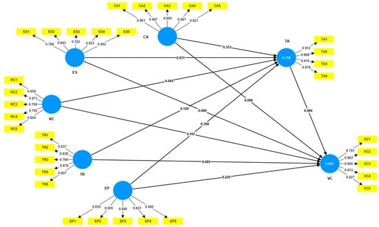 Economic Stability (ES) (H4a: β = 0.028, t = 2.015, p = 0.044) has a small but significant indirect effect on VC through TAs, which supports the idea of partial mediation. This suggests that while economic stability contributes to GVC participation, its impact is somewhat dependent on technological advancements. Also, Technological Resources (TRs) (H4c: β = 0.059, t = 2.035, p = 0.042) and Environmental Policies (EPs) (H4e: β = 0.183, t = 3.996, p < 0.01) show partial mediation, which means that these factors affect VC directly, but new technologies make their impact on companies’ global engagement even stronger.