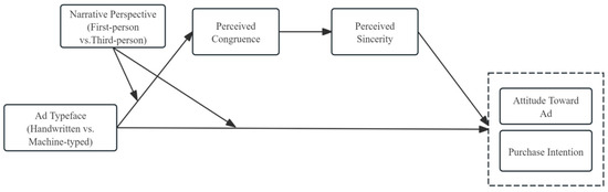 When paired with handwritten typefaces, first-person narratives strengthen the perception of human presence created by the handwritten elements. This combination enhances the perception of effort and care, which makes the advertisement feel more approachable and engaging [50]. Consequently, this combination is more likely to drive positive consumer behavioral intentions, such as favorable attitudes and purchase decisions. In contrast, third-person narratives, with their detached tone, may not effectively reinforce the humanizing effect of handwritten fonts, which leads to weaker consumer responses. Therefore, the study postulates the following: