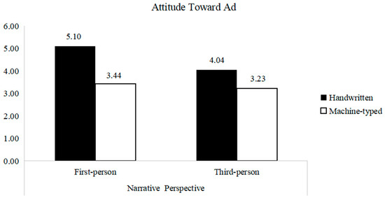 Consumer response: attitude towards ads. Two-way ANOVA was conducted to test the result of attitudes toward ads. The main effect of typeface on attitude toward ads was significant (F (1, 202) = 45.02, p < 0.001, η2 = 0.182), and there was a significant effect of narrative on attitude toward ads (F (1, 202) = 12.03, p < 0.001, η2 = 0.056). Moreover, their interaction effect was also significant (F (1, 202) = 5.28, p < 0.05, η2 = 0.025). More specifically, when ad narration was first-person, handwritten typeface (M = 5.10, SD = 1.18) engendered significantly more favorable attitudes than machine-typed variants (M = 3.44, SD = 1.47, F (1, 103) = 40.74, p < 0.001). When ad narration was third-person, handwritten typeface (M = 4.04, SD = 1.29) also triggered more positive attitudes than machine variants (M = 3.23, SD = 1.33, F (1, 99) = 9.71, p < 0.01) (see Figure 2).