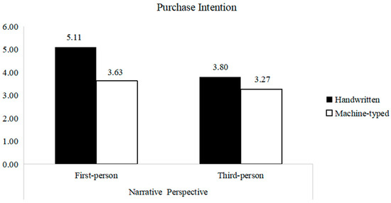 Consumer response: purchase intention. A two-way ANOVA was conducted to test purchase intention. The main effect of the typeface was significant (F (1, 202) = 26.59, p < 0.001, η2 = 0.116), and the main effect of the narrative was also significant (F (1, 202) = 18.67, p < 0.001, η2 = 0.085). More specifically, the interaction effect of typeface x narrative perspectives was significant (F (1, 202) = 5.92, p < 0.05, η2 = 0.025). When the ad adopted first-person narration, the use of handwritten typeface (M = 5.11, SD = 1.33) led to a higher level of purchase intention compared with machine-typed writing (M = 3.63, SD = 1.61, F (1, 103) = 26.54, p < 0.001). When ads utilized a third-person perspective, handwritten typeface (M = 3.80, SD = 1.37) also triggered higher purchase intention than machine ones (M = 3.27, SD = 1.27, F (1, 99) = 4.09, p < 0.05) (see Figure 3). These results supported H2.