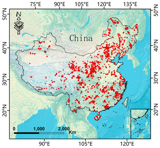 The SOC density (SOCD) data used in this study were obtained from the 2010s Chinese Terrestrial Ecosystem Carbon Density Dataset compiled by Xu Li [25]. The dataset consists of the following two parts: one part is officially published literature data and the other part is experimental data for the subject group. SOC data recorded 7683 entries, including 4536 SOC entries ranging 0–20 cm in depth (4356 and 180 entries for literature data and experimental monitoring data, respectively). Each data record details the ecosystem type of the sample site, the location of the sample site (longitude and latitude), SOCD (kg m−2), sampling time, data type, and data source. The sources of organic carbon density in soil can be divided into two categories, direct data and indirect data. Direct data refer to carbon density data provided by experimental tests or the literature or SOC data calculated by relevant parameters without conversion or derivation. Indirect data refer to carbon density data that are not provided in experiments or the literature, and the information on related parameters is incomplete and is obtained by further derivation [25].