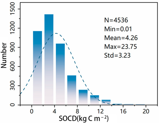 From the data of SOC statistics of the sampling points, the distribution of the SOC content showed a skewed distribution trend. With the increase of organic carbon density, the number of statistical sampling points showed fluctuating changes, and the distribution of sampling points within different SOC intervals was not uniform. The number of sampling points was relatively high in the organic carbon density interval of 0–5 kg C m−2. In the higher SOCD interval of 10–20 kg C m−2, the number of sampling points was relatively low, which may be limited by the rarity of the samples or limitations in the sampling process (Figure 2).