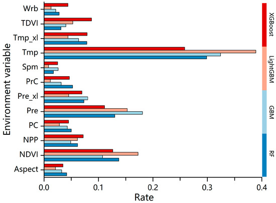 Regarding model accuracy statistics (Table 2), overall, the RMSE of the model is not much different and is within acceptable range, the decision coefficient of the model is also higher overall, and the time cost of mapping is shorter for XGB and LGB. The modeling with RF has a high accuracy, but its mapping time cost is too high, and the model index is only 0.25, while the accuracy of the XGB model is slightly lower than that of RF. However, its time cost is only 164 s, and the model index reaches 0.55, which is the maximum value of the four models. The variable importance statistics of the four models shows a similar trend, with the most important covariates all being mean air temperature, followed by mean precipitation and net primary productivity of vegetation, and the rest of the variables are almost equal in importance (Figure 3).
