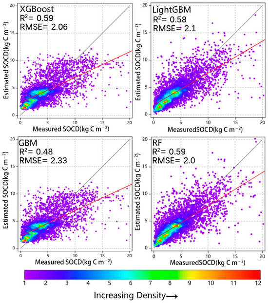 Scatterplot of measured and estimated SOCD (kg C m−2) for assessing the average model performance of different modeling approaches. The solid gray line represents the 1:1 line. The red line represents the average model performance during the calibration and validation phases. Point density increases gradually from purple to red.