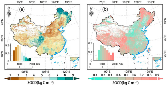 Extreme Gradient Boost (XGBoost) model predictions. (a) Plot of surface (0–30 cm) SOCD (kg C m−2) at the national spatial scale, with the inset at the bottom left of each panel showing area ratios at different SOC levels. (b) Uncertainty in model estimates. Uncertainty is quantified as the standard deviation of the Extreme Gradient Boost (XGBoost) model simulation for each pixel point. The inset at the bottom left of each panel shows the area ratio at different SOC std levels.