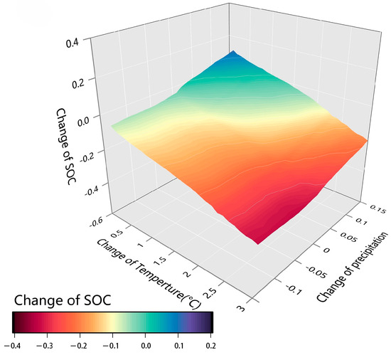 It was observed that the maximum loss of SOC occurred under scenarios of a 3 °C rise in temperature and a 15% reduction in precipitation. This finding highlights the potential severe threat posed by extreme combinations of increased temperature and decreased moisture to soil carbon stocks in the context of climate change. Such conditions could significantly impair soil ecological functions and agricultural productivity. Notable regional disparities in response to temperature changes are evident, with approximately 25% of regions experiencing a 10% reduction in SOC under a 1.45 °C temperature rise. The southwestern region exhibited a higher resilience to temperature thresholds, while the central region showed relatively greater sensitivity. This finding emphasizes the critical importance of region-specific adaptation strategies; future management practices should take into account local climatic characteristics and soil types to devise more effective response plans. The impact of precipitation changes on SOC also reveals regional variability. The southern regions demonstrate a heightened sensitivity to decreased precipitation, whereas the central and northern regions exhibit a comparatively weaker response. This phenomenon may be closely linked to local soil properties, vegetation cover, and land use practices. In particular, in the southern regions, variations in precipitation may have a more pronounced effect on soil moisture and nutrient dynamics, thereby influencing the stability of SOC.
