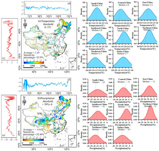 SOC Sensitivity to temperature and precipitation. (a,b) National climate thresholds under the 10% reduction scenario for SOC; density statistics for temperature and precipitation thresholds across various regions (SC, CC, EC, SW, NC, NE, and NW represent South China, Central China, East China, Southwest China, North China, Northeast China, and Northwest China, respectively). The curves depict the distribution of changes in temperature thresholds, while the blue dashed line indicates the median change in precipitation for each region. (c–f) Changes in longitude and latitude.