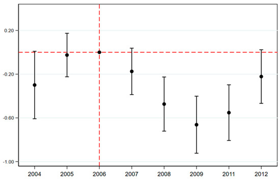 where denotes the year dummy variable. This paper excludes the year 2006, thus capturing the influence of ETC on firms’ pollution discharges relative to 2006. If −2, the coefficients represent the effect of years before this policy shock. If they are insignificantly different from zero, there are no systematic differences between the firms in the treatment and control groups, thus meeting the parallel trend assumption.