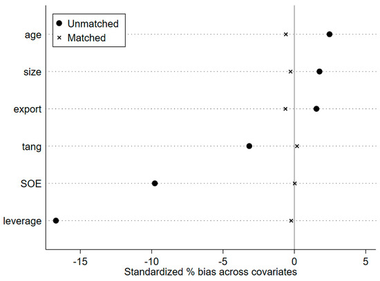 To mitigate potential selection bias, this paper employs the PSM-DID approach to reassess the impact of ETCs on pollution control. Propensity score matching (PSM) is employed to construct a more comparable control group by matching treated firms with non-treated firms based on observable characteristics, thereby reducing potential selection bias. Specifically, this paper first implements a 1:3 nearest-neighbor matching algorithm to construct a comparable control group, ensuring that treated and non-treated firms exhibit similar pre-treatment characteristics. A balancing test is then conducted to evaluate the standardized bias of covariates before and after matching. As Figure 3 presents, the standardized bias of all covariates drops dramatically after matching, and their figures are all around zero, suggesting a satisfactory balance after matching.