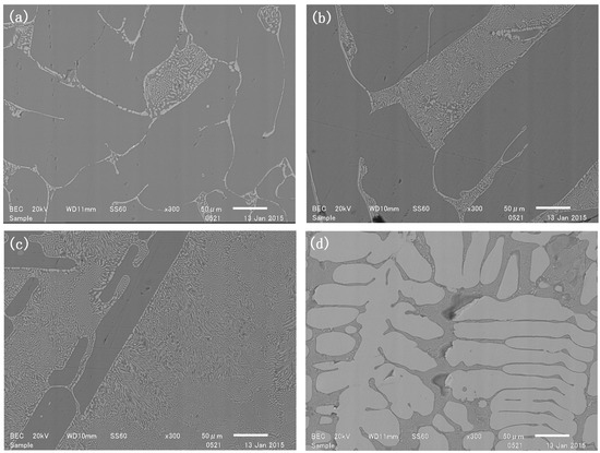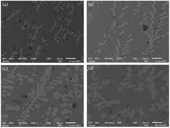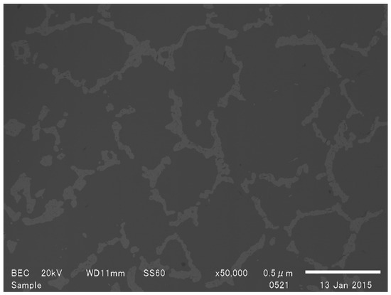 The cross-sections of the reacted samples (Figure 1) showed that the ratio of the TiSi2 phase in the reduction increased with an increasing rs. The TiSi2 phase area fractions in these cross-sections were measured to be 6%, 13%, 39% and 78% in samples 1 to 4, respectively. It is well known that the TiSi2–Si binary system exhibits eutectic behavior, and the alloy in sample 4 was located on the TiSi2 rich side of the binary system. The image analysis indicated that the TiSi2 phase area fraction increased as a cubic function of increasing rs. For samples with a lower rs, most of the TiSi2 phase was aggregated at the boundaries of the pure silicon grains. As rs increased, the proportion of TiSi2–Ti solution mixture increased, while the pure silicon phase decreased. When rs reached four, the principal phase transitioned to pure TiSi2 dendritic crystals, the pure silicon phase disappeared, and the Ti solution phase segregated into the interdendritic regions, accompanied by some TiSi2 fine grains.