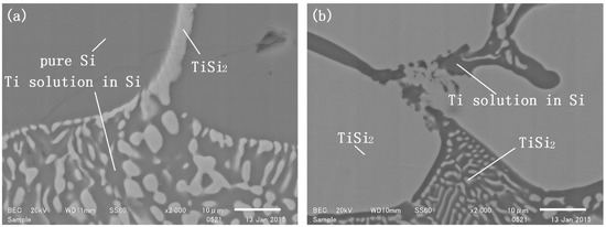 Pure bulk TiSi2 could be produced when the reaction time was prolonged. As shown in Figure 3a, the area fraction of TiSi2 in sample 3 increased from 39% to 61% when the reaction time was extended from 2 h to 5 h. After 12 h, the Si matrix was almost completely transformed into bulk TiSi2 (Figure 3b). Similarly, bulk TiSi2 phase was observed in sample 4 after 5 h of reaction.