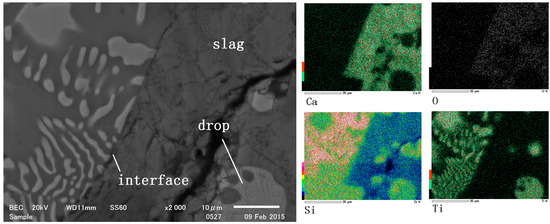 During the reaction, alloy drops were also observed within the slag. This was due to the higher density of titanium silicides compared to slag. TiSi2 formed in the molten silicon and subsequently separated from the molten silicon phase as droplets in the reaction (Figure 4). The elemental mapping in Figure 4 demonstrated that the titanium content in the slag was significantly lower than in the alloy phase, indicating that the formation of intermetallics in the molten silicon facilitated the extraction of Ti from the slag. Additionally, the titanium-to-silicon ratio in the droplets was higher than that in the floating alloy, suggesting that these droplets were denser and continued to form additional titanium silicide phases as the reaction progressed.