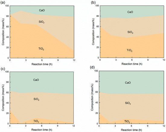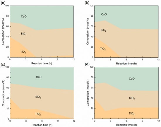 Variation of slag compositions during the reaction at different reaction times with sample numbers (a) 5; (b) 6; (c) 7; (d) 8.