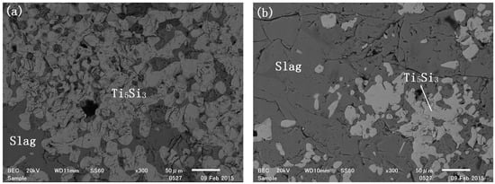 The alloy phase, which mainly contained elemental silicon, floated on the slag in the reaction. SEM graphs of the alloy phase in the reacted samples are shown in Figure 1. SEM/EDS measurements revealed that the alloy consisted of three different phases (Figure 2). The light-colored phase was identified to be TiSi2, with an EDS-determined Ti:Si molar ratio of approximately 64:36. The dark-colored phase in the gaps between the TiSi2 grains was a Ti solution in Si, with the Ti content varying between 2.6~8.6 mol%. The other dark-colored phase in larger pieces was identified as pure silicon. No alloy phase containing more than 67 mol% titanium was detected, indicating that Ti5Si3 did not form within 2 h under these experimental conditions.