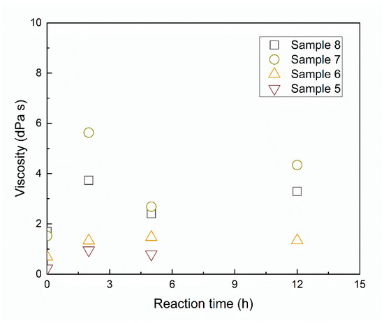 Prediction of slag viscosity during the reaction at different reaction times with sample numbers from 5 to 8.