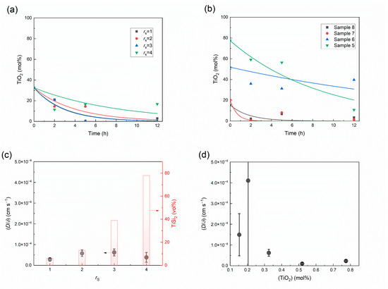 Experimental and modeling curves with (a) various rs and (b) various slag compositions; (c) kinetic parameters of the titanium silicide synthesis process with variation of the slag/silicon ratio, where the volume fraction of TiSi2 in the alloy after reaction for 2 h is also shown; and (d) TiO2 mole fraction in the slag.
