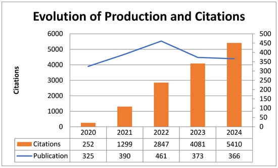 In terms of the number of publications, there is a noticeable upward trend between 2020 and 2022, followed by a slight decline in 2023 and 2024. From 325 publications in 2020, the number increased to 461 in 2022, suggesting intensified research activity during the pandemic. However, in 2023 and 2024, the number of publications slightly decreased to 373 and 366, respectively. This decline may be attributed to the field reaching a level of maturity where foundational studies have already been completed, and research is now shifting towards more specialized directions.
